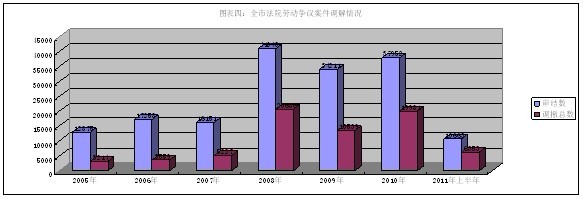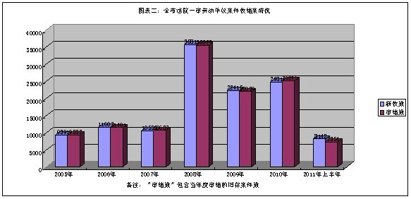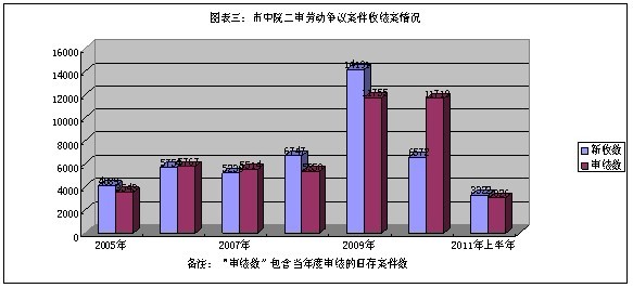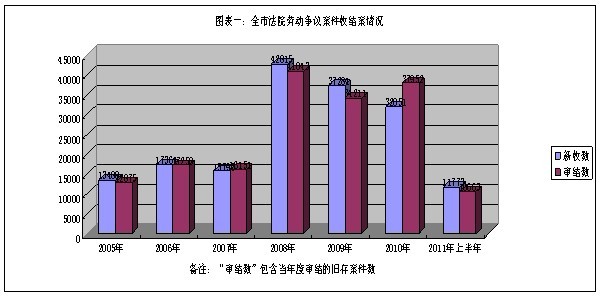 2005年至2011年6月份,全市两级人民法院共审结(含旧存,下同)劳动争议案件170153宗,其中,2005年审结劳动争议案件12875宗,2006年审结劳动争议案件17258件,同比上升34.04%; 2007年审结劳动争议案件16151宗,同比下降6.41%; 2008年审结劳动争议案件41043宗,同比上升154.12%;2009年审结劳动争议案件34211宗,同比下降16.65%;2010年审结劳动争议案件37952宗,同比上升10.94%,2011年上半年审结劳动争议案件10663件,同比下降29.73%(详见图表一、二、三)。