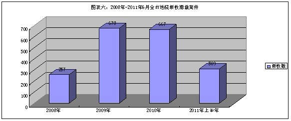 2、特别程序案件数量相对平稳。2008年5月1日,《劳动争议调解仲裁法》实施后,市中院开始受理申请撤销劳动争议仲裁裁决案件,此类特别程序案件一直参照适用民事一审普通程序进行审理。截至2011年6月,中院共受理撤裁案件1911宗。其中2008年257件,2009年678件,2010年667件,2011年1-6月受理309件。2009年后新收案件趋向稳定。(详见图表六)。