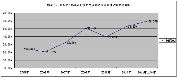 2、全市法院劳动争议案件调解结案情况。2005年至2011年6月份,全市两级人民法院共调解劳动争议案件72559宗,其中,2005年调解劳动争议案件3214宗,2006年调解劳动争议案件3559件,同比上升10.73%; 2007年调解劳动争议案件5227宗,同比上升46.87%;2008年调解劳动争议案件20686宗,同比上升295.75%;2009年调解劳动争议案件13539宗,同比下降34.55%;2010年调解劳动争议案件19981宗,同比下降47.58%。2011年1-6月份调解劳动争议案件6353件,同比上升26.71%(详见图表四、五)。